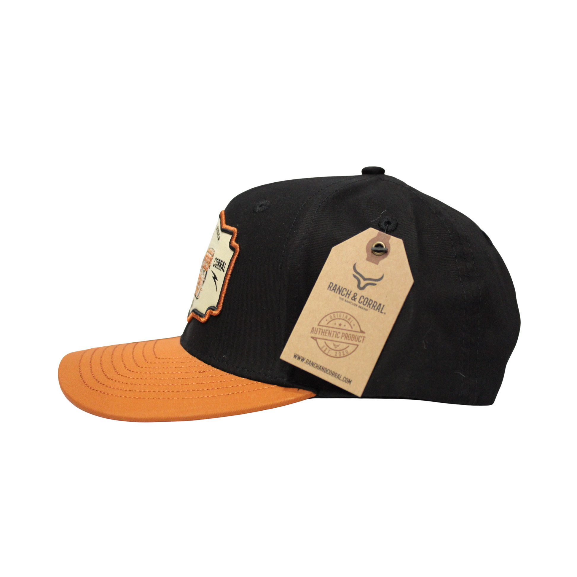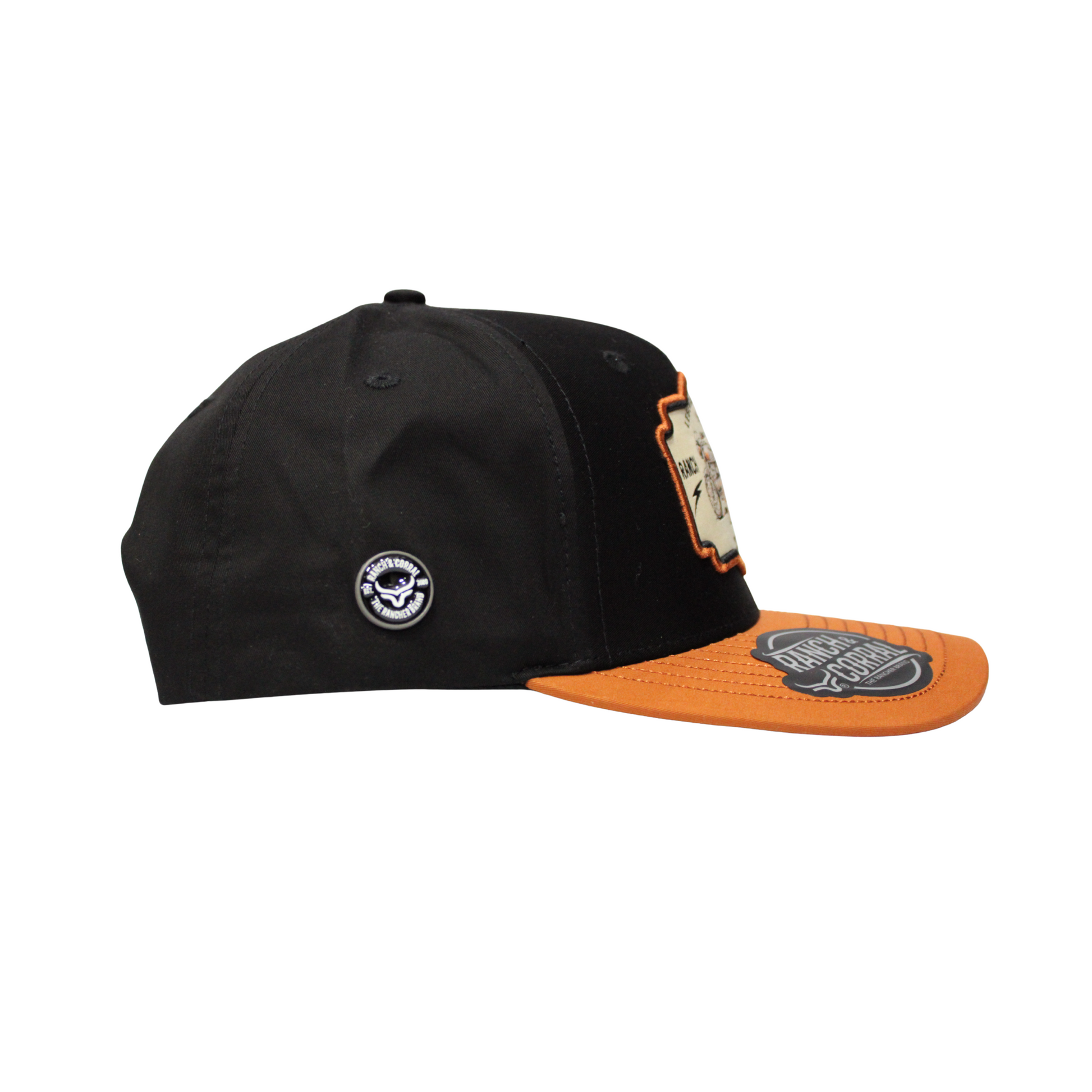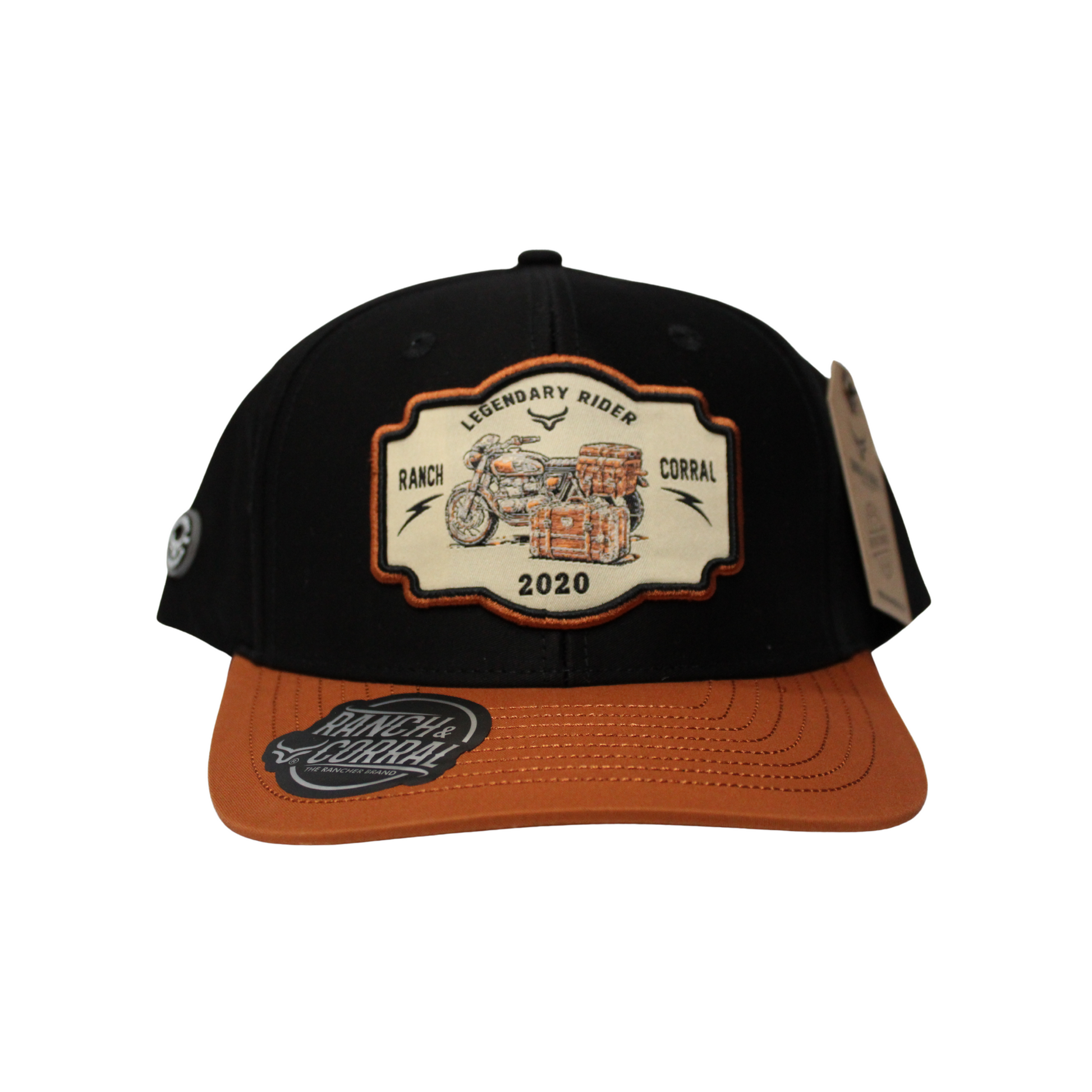 Diseño negro con visera café y parche bordado de motocicleta vintage. Un modelo que une el espíritu libre del rider con la esencia ranchera.