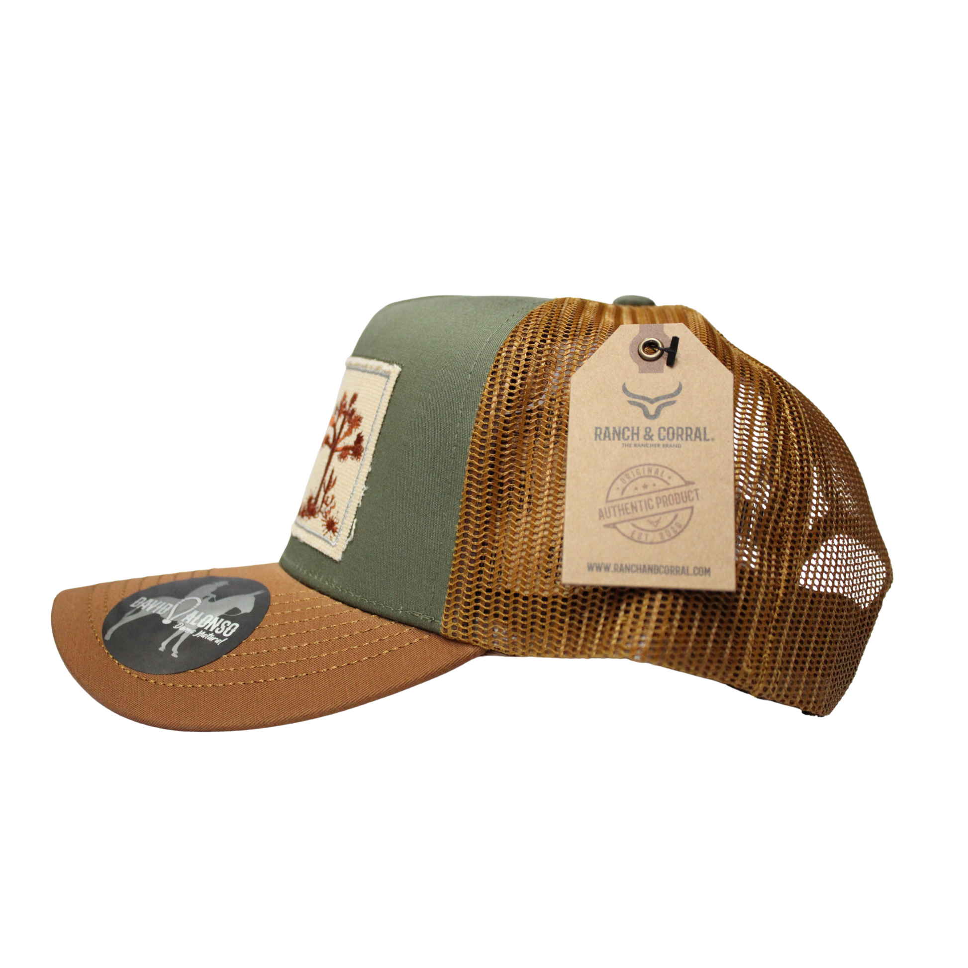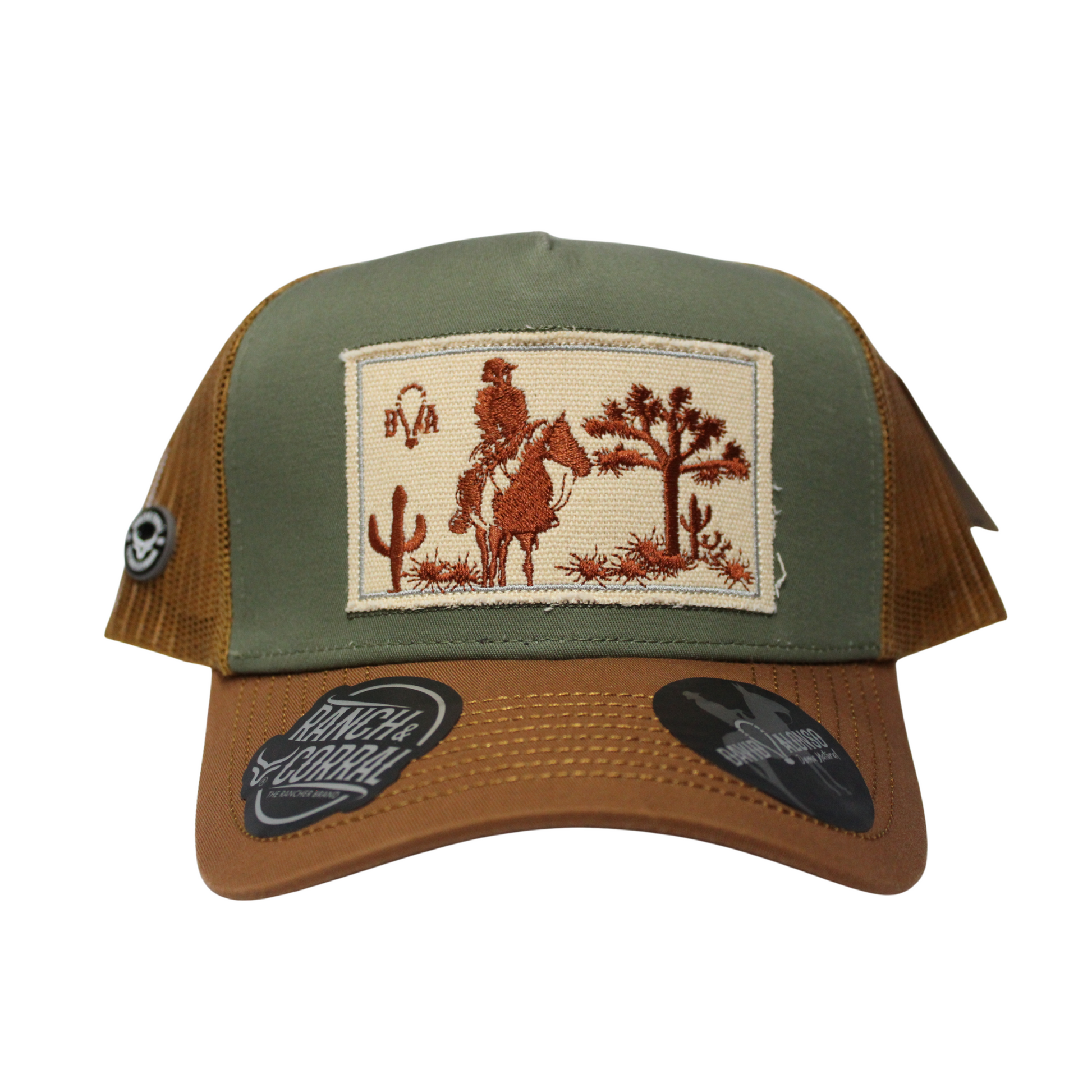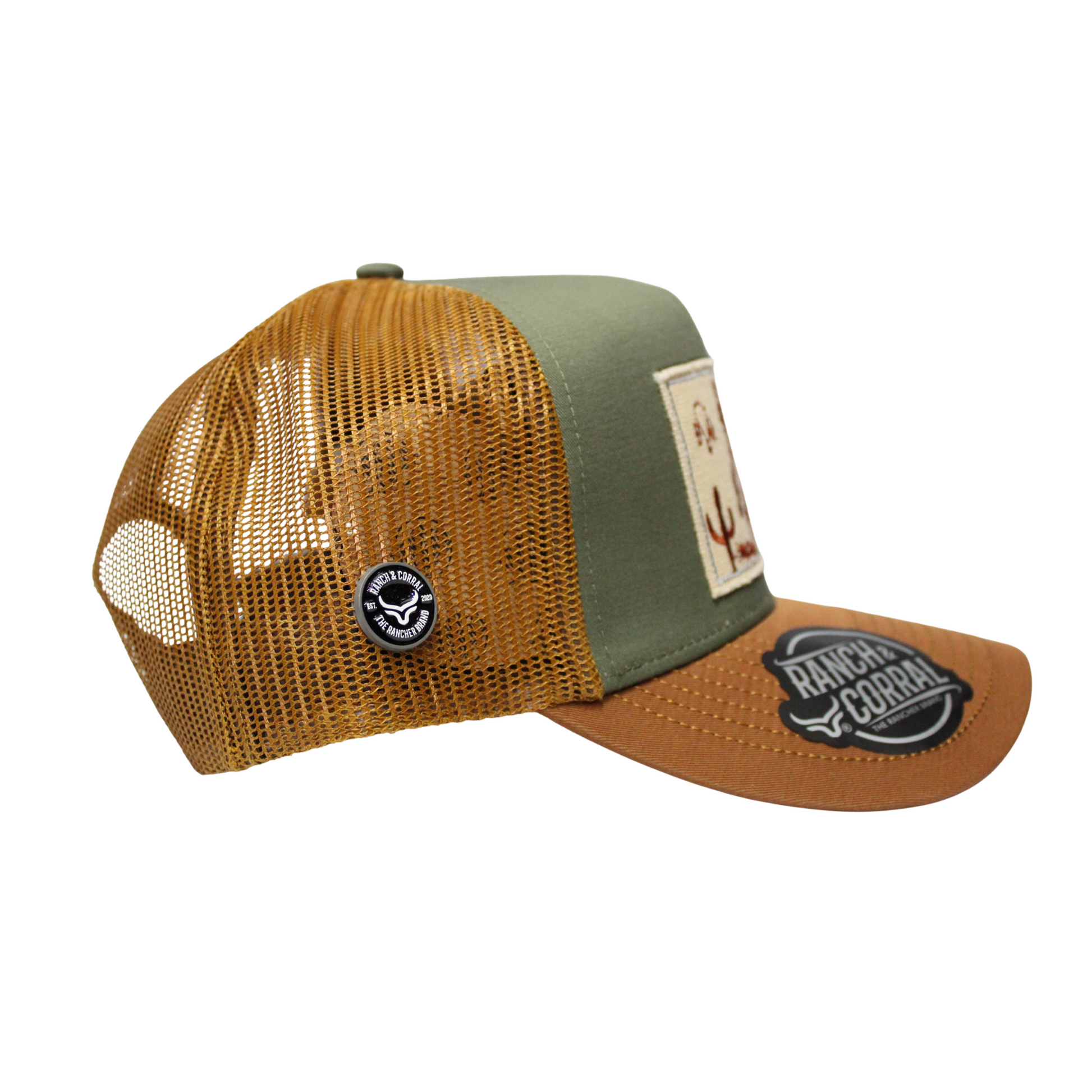 Gorra trucker en verde olivo con visera camel y malla café. Parche bordado con jinete en el desierto, evocando el espíritu libre del viejo oeste.