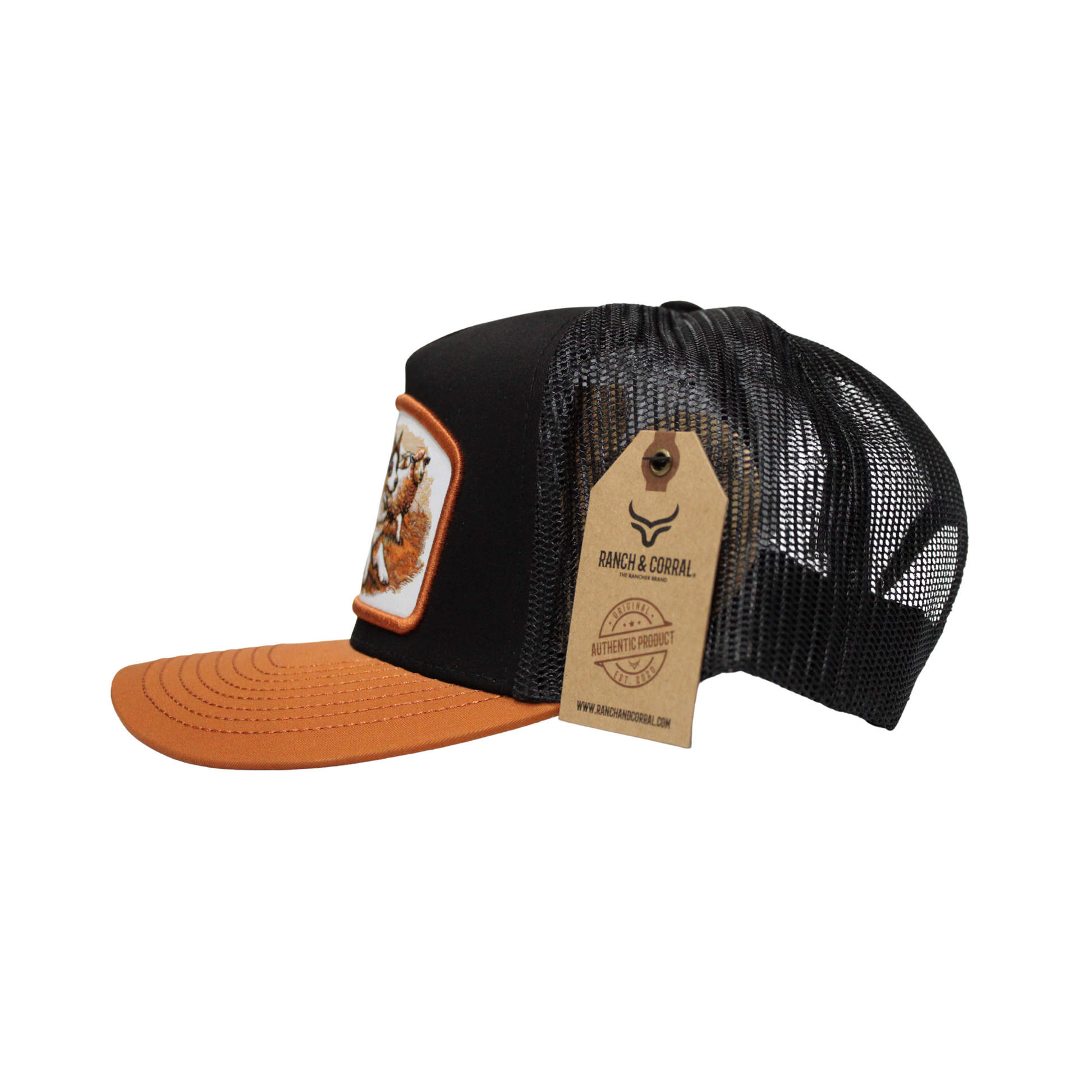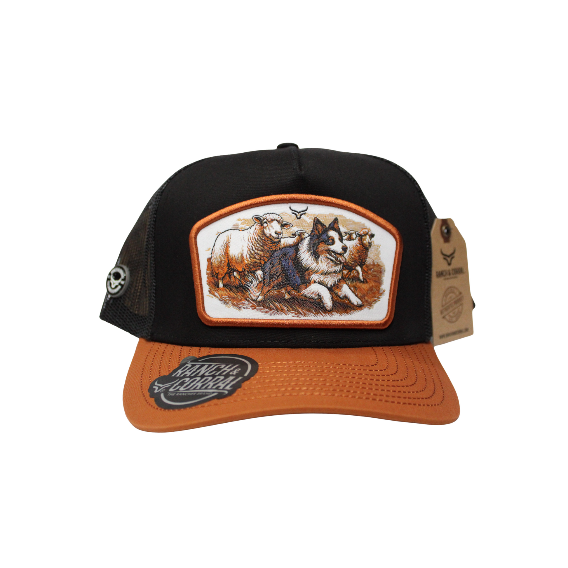 Gorra trucker en negro con visera camel y malla negra. Parche bordado con perro pastor y ovejas, símbolo de lealtad y trabajo en el rancho.