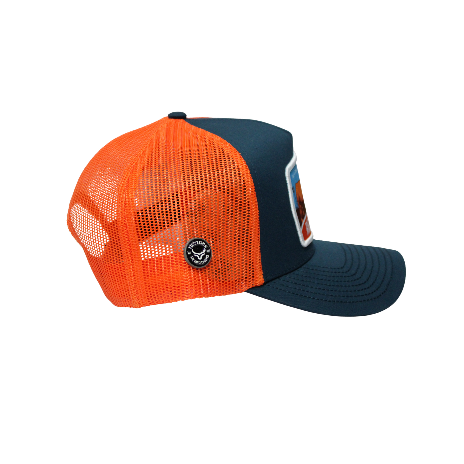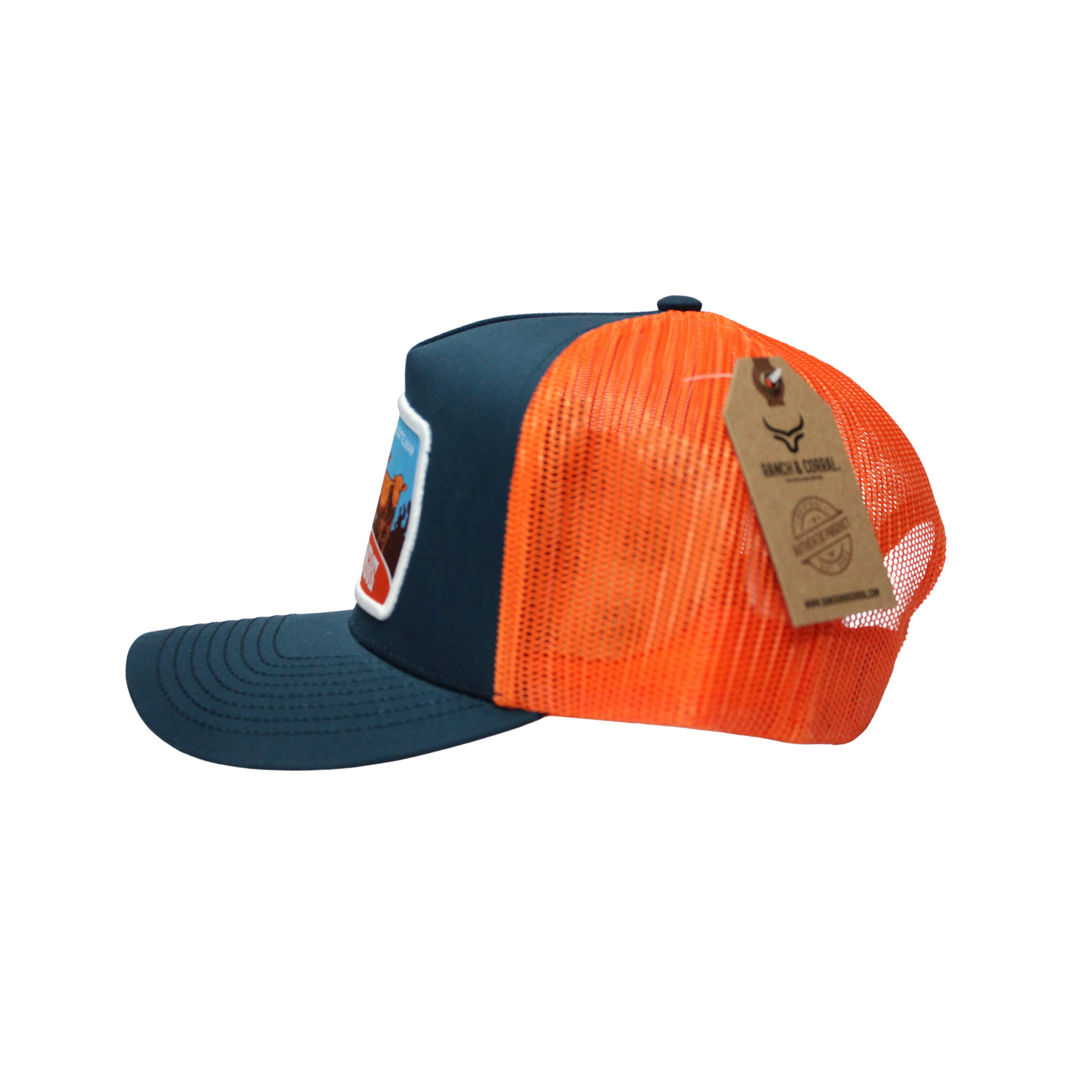 Gorra trucker azul marino con malla naranja, parche bordado inspirado en el ganado Red Angus. Fresca, cómoda y con estilo ranchero auténtico.