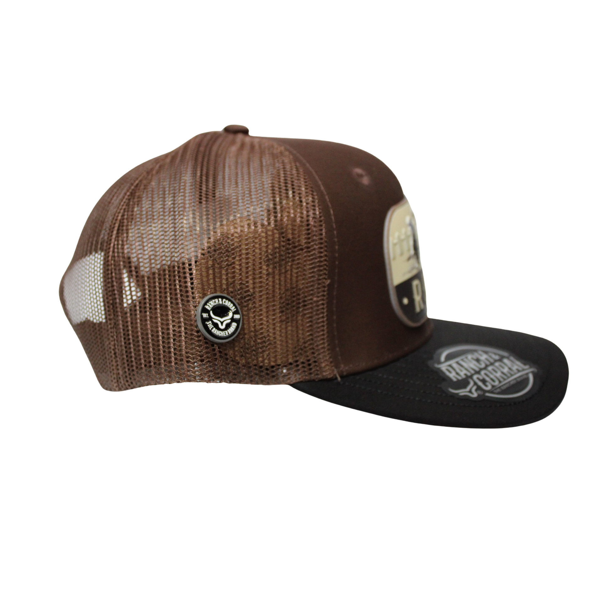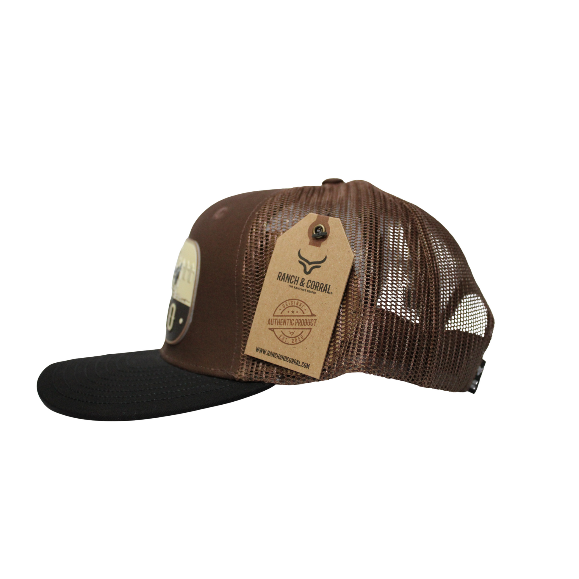 Gorra trucker en color café con malla trasera. Frontal en tono sólido con parche bordado tipo escudo, que muestra una escena de rodeo con jinetes y la palabra RODEO en la parte inferior.