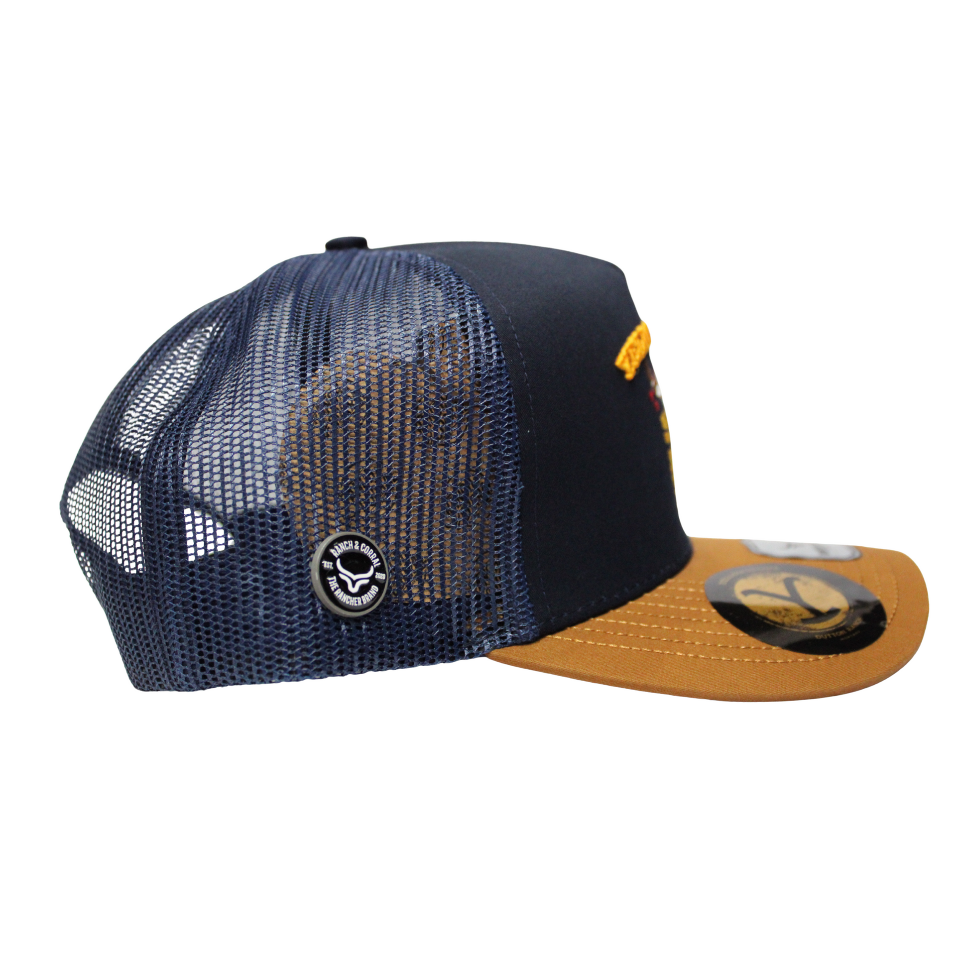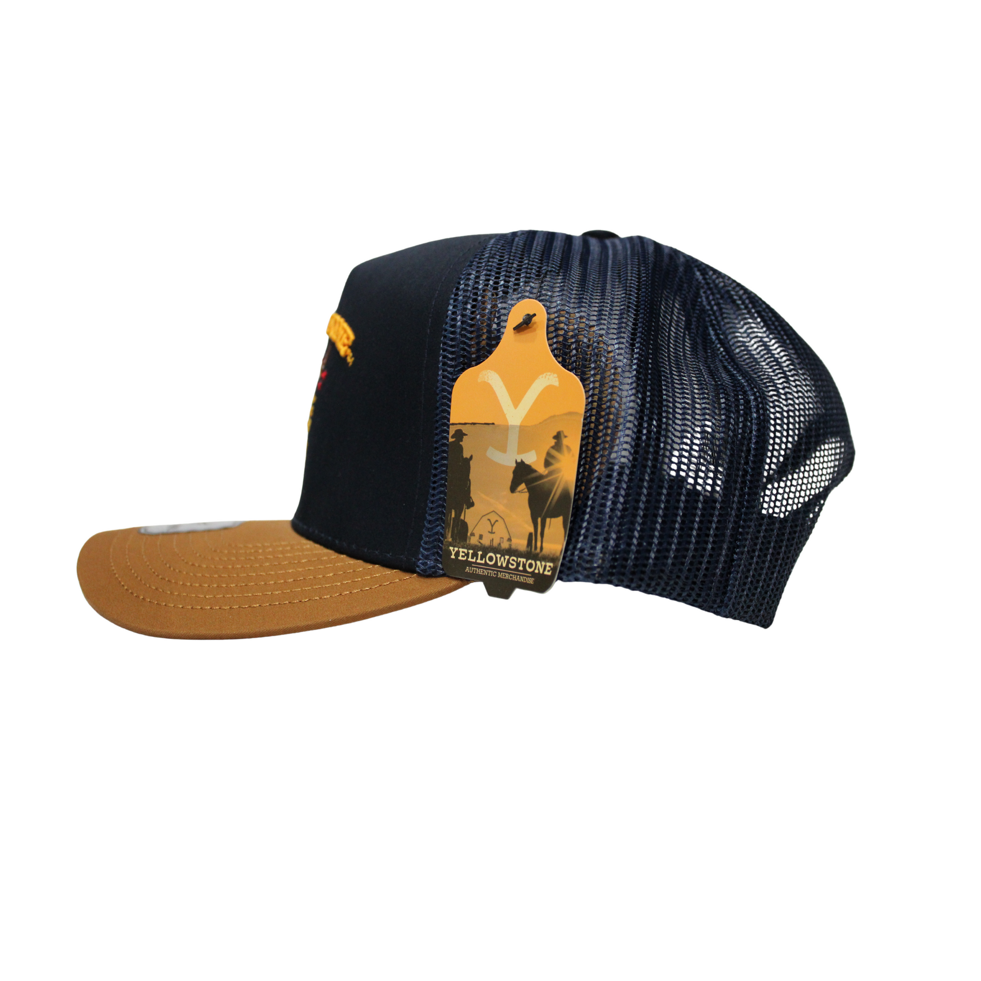 Gorra trucker en color azul marino con malla trasera. Bordado frontal con calavera de toro y cuernos, acompañado del texto Yellowstone y la frase “We Don’t Choose The Way”, resaltando un estilo rudo y auténtico.